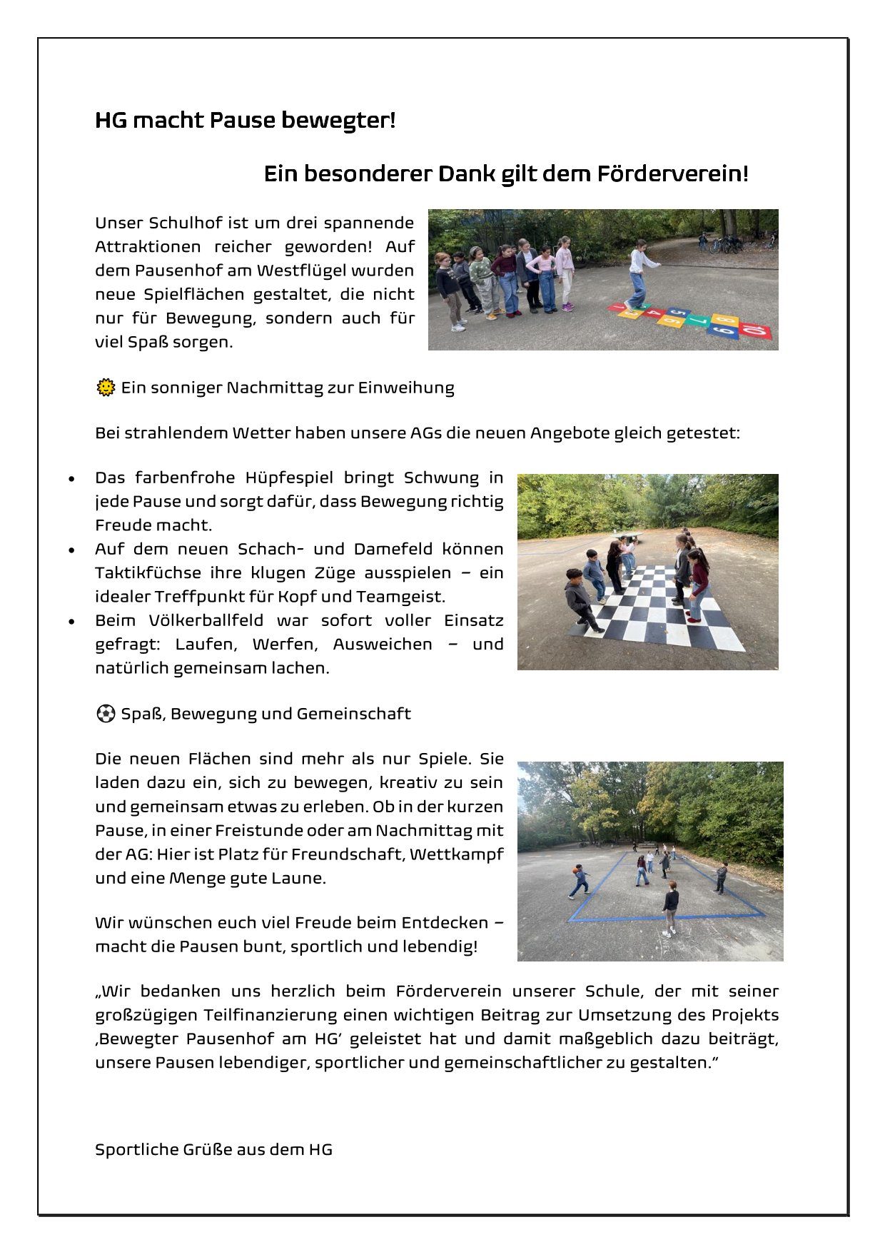 Der Pausenhof am Westflügel hat 4 neue Spielflächen dazu bekommen. Gerne haben wir dies mit einer Teilfinanzierung unterstützt. So steht einer "bewegten" Pause nichts mehr im Wege ;-) Das HG hat uns freundlicherweise einen Bericht mit ersten Eindrücken zur Verfügung gestellt. Diesen finden Sie nachfolgend: