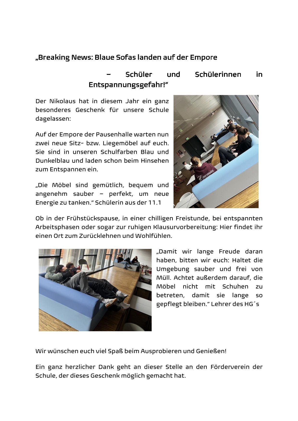 Konzentriert über viele Stunden hinweg dem Unterricht zu folgen macht müde. Damit sich die Schüler:innen zwischendurch ausruhen können, haben wir ihnen zwei tolle Sitz- und Liegegelegenheiten im Wert von 1.680 € geschenkt.